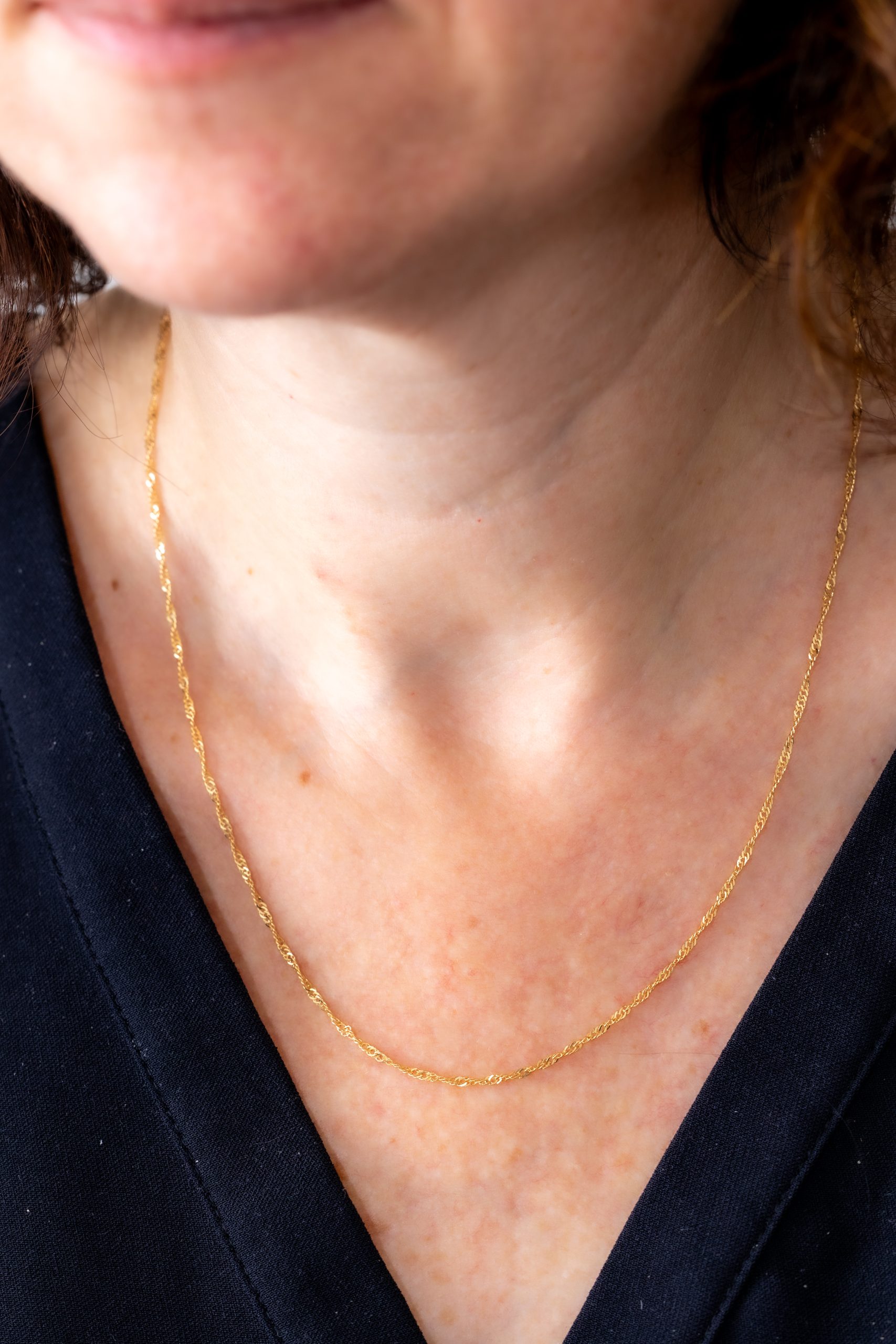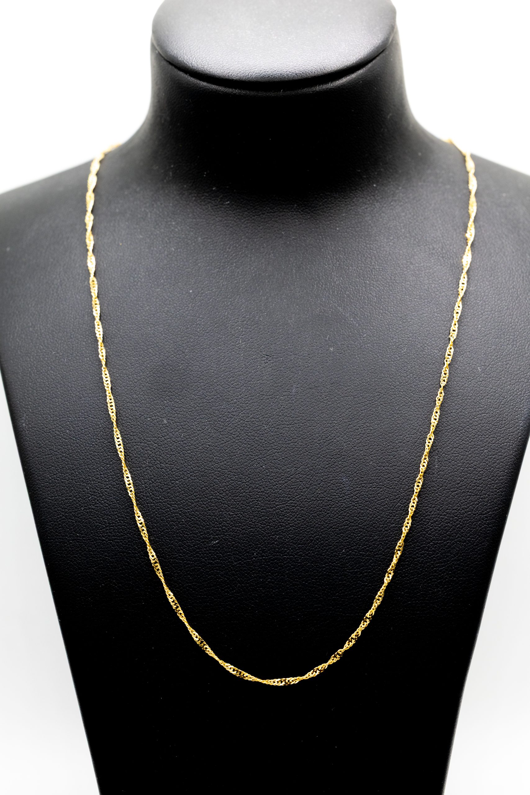 Cadena de oro amarillo de 18k, tipo Singapur. Peso 2 gr. Longitud 45 cm. Grosor 1.5 mm Accede a este enlace para realizar tu compra