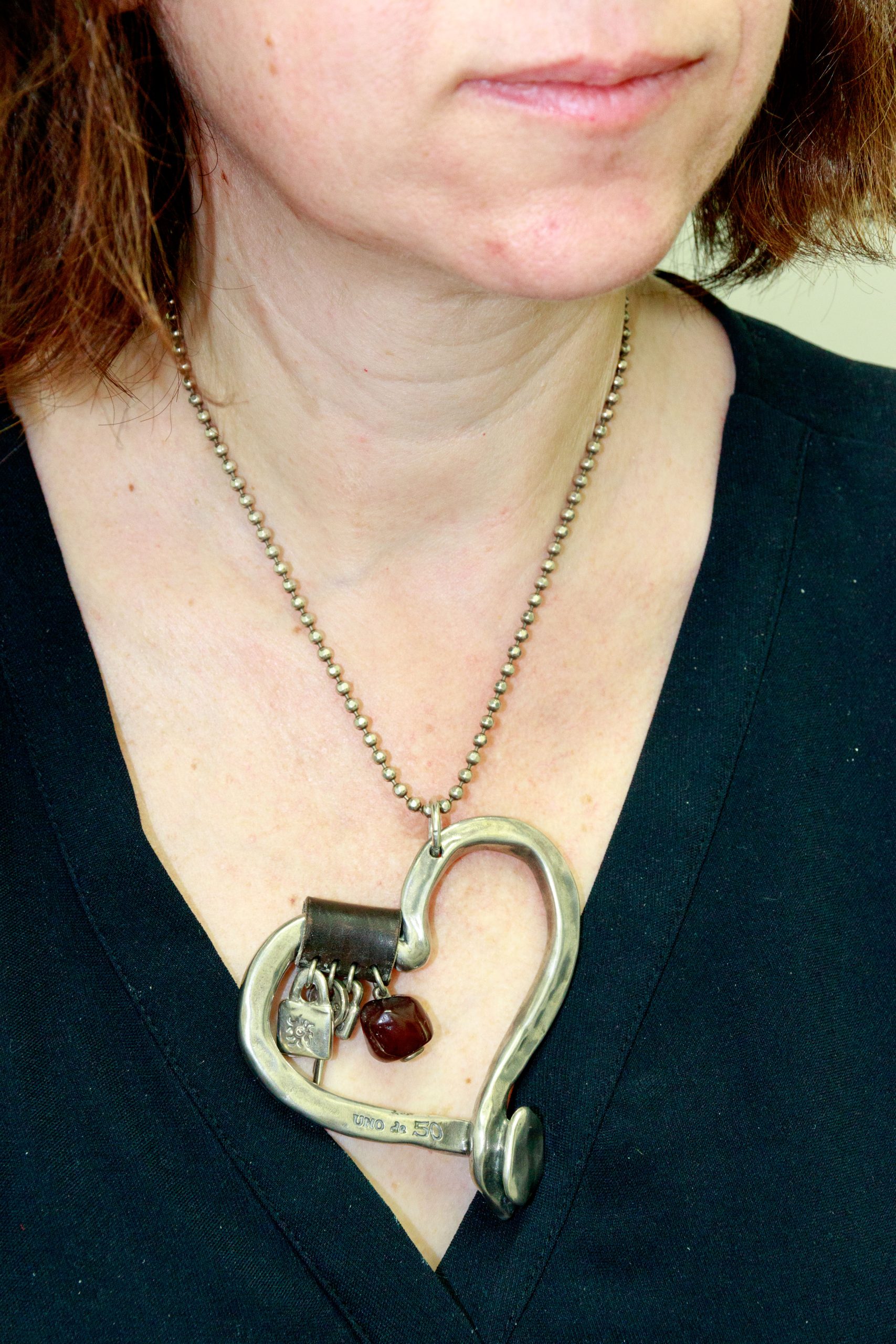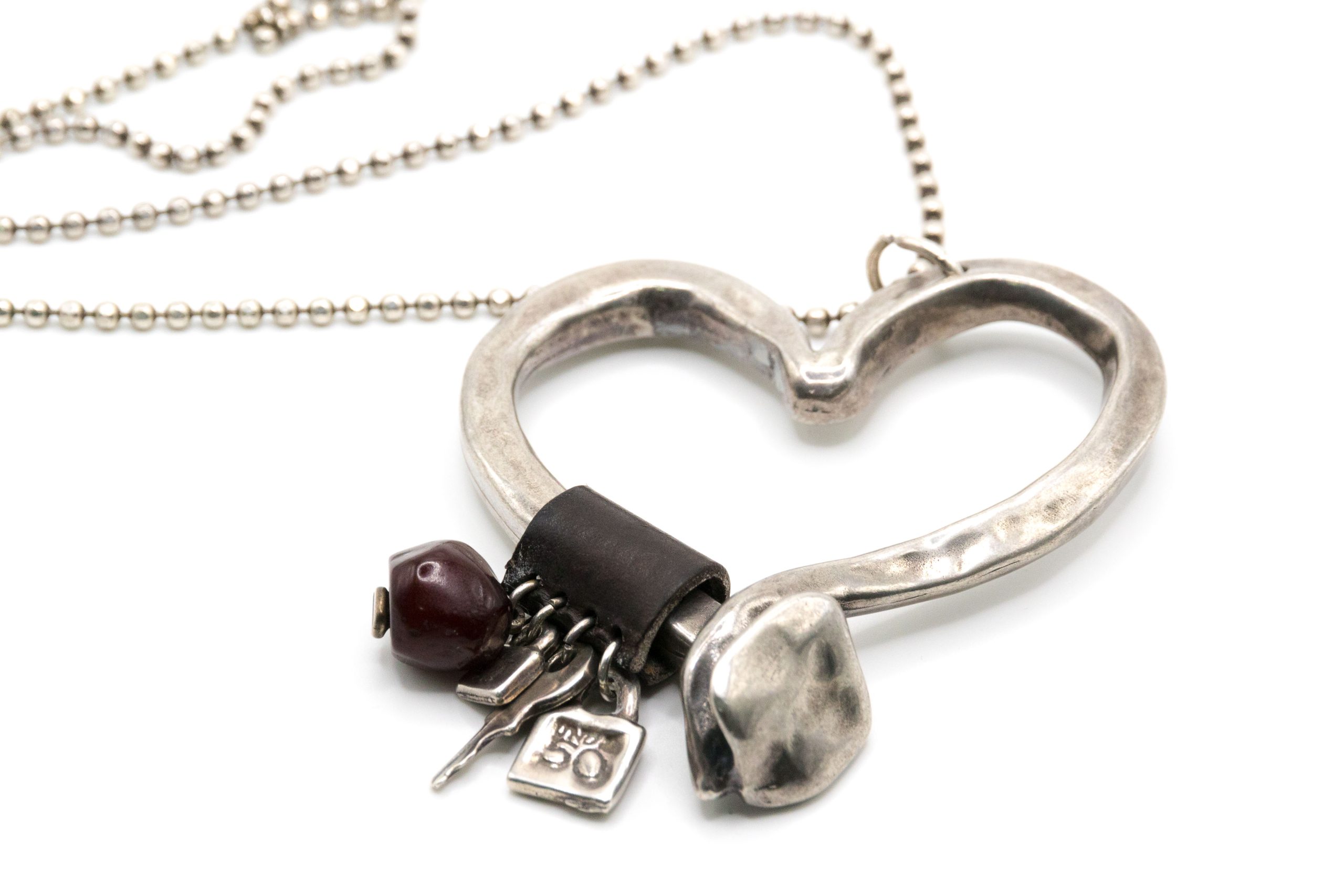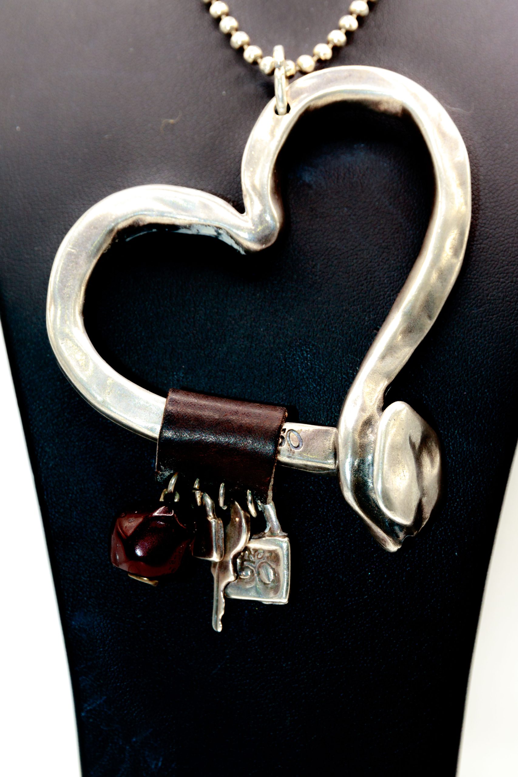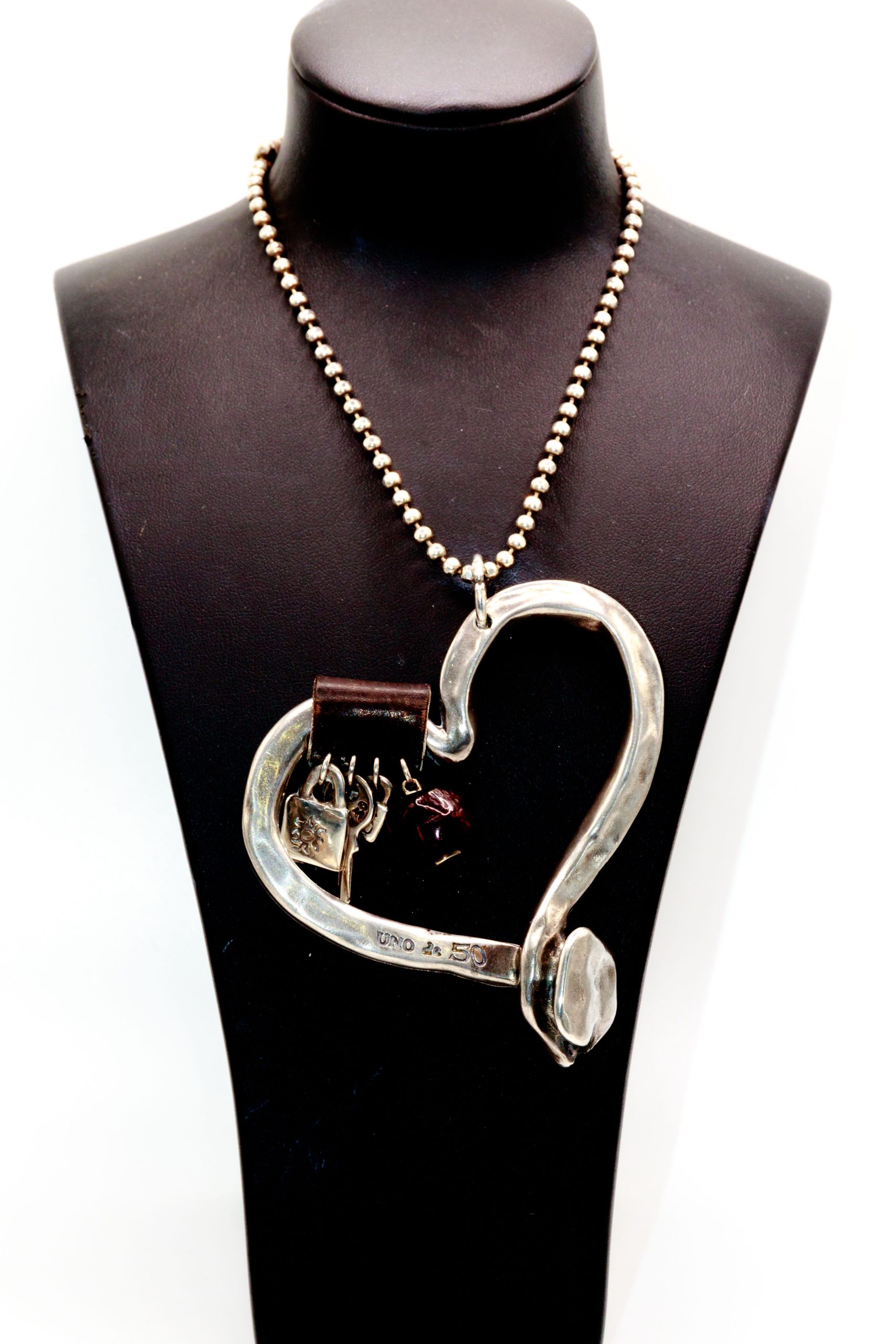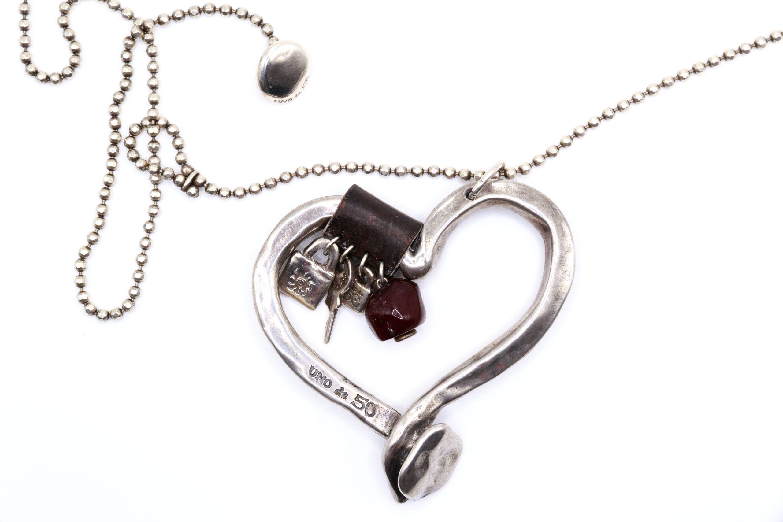 Cadena con charm en forma de gran corazón enroscado del que penden icónicos abalarios de la marca uno de 50 como la llave y el candado. Con detalles en cuero. Alienación de diversos metales bañados en plata de ley. Longitud variable y máxima de 90,5 cm. Medida del corazón 8 cm. Peso 80,8 gr. Accede a este enlace para realizar tu compra