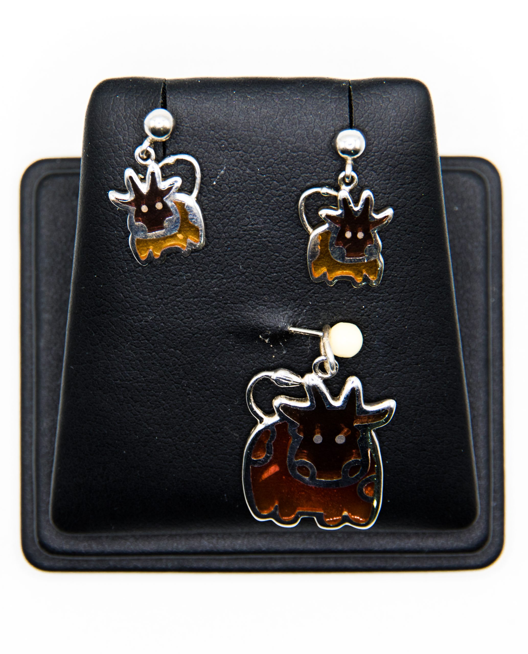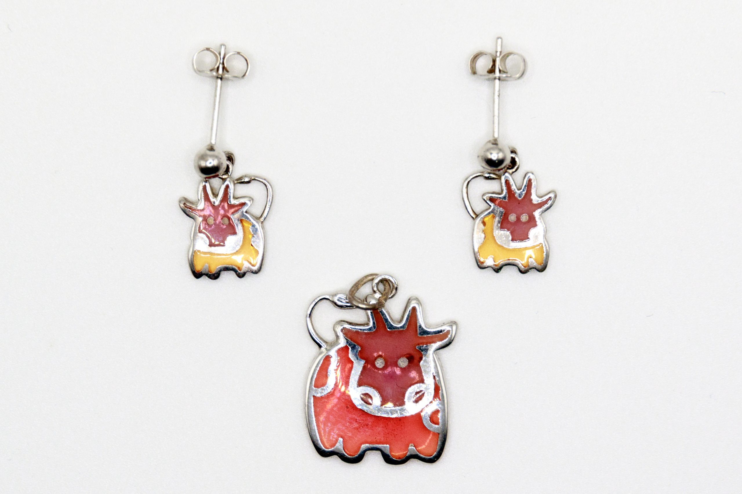 Conjunto de plata de dije con forma de vaca y pendientes a juego. El cuerpo no tiene detrás chapa, lo que permite ver mejor los colores marrones y naranjas cuando se usan. Tuerca a presión. Peso del conjunto 4.2 gr. Accede a este enlace para realizar tu compra